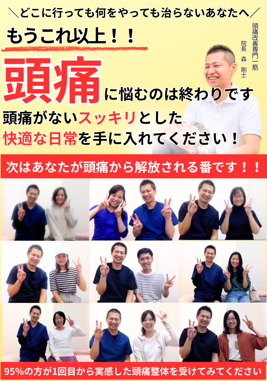 頭痛専門整体院 翔の治療は頭痛に特化した施術です。今までどこに行っても良くならなかったあなたの頭痛に真剣に寄り添い頭痛治療をさせていただきます。是非、ご相談ください。あなたのご来院を心よりお待ちいたしております。