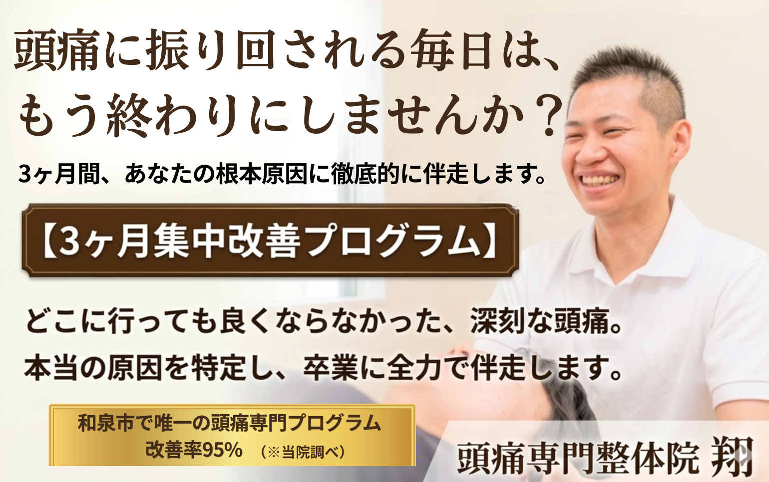 頭痛専門整体院 翔の治療は頭痛に特化した施術です。今までどこに行っても良くならなかったあなたの頭痛に真剣に寄り添い頭痛治療をさせていただきます。是非、ご相談ください。あなたのご来院を心よりお待ちいたしております。