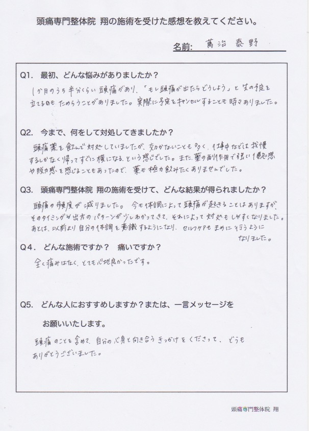 (和泉市 釡野 鈴可さん30代/頭痛コース実施)